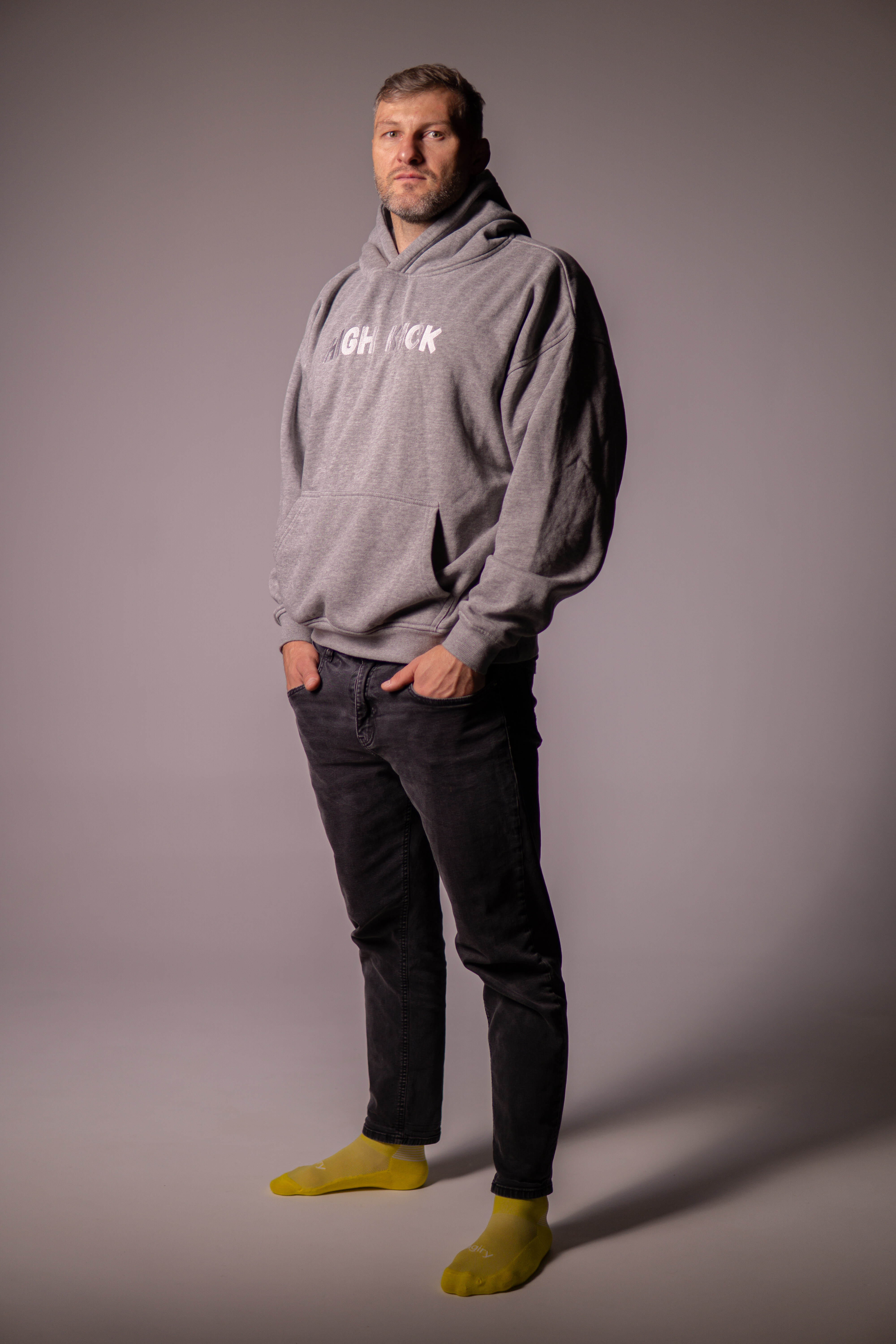 Bluza szara haft HIGH KICK to połączenie minimalistycznego stylu i maksymalnego komfortu. Uszyta z miękkiej, wysokogatunkowej bawełny, posiada obszerny kaptur i dużą kieszeń typu kangurka. Na przodzie haftowany napis HIGH KICK, który nadaje całości charakteru streetwearowego i sportowego zarazem. Idealna na co dzień, trening i chłodniejsze dni.